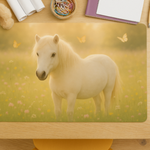 Schreibtischunterlage weisses Pferd auf Blumenwiese – Pastellfarbenes Pferdemotiv für Kinder