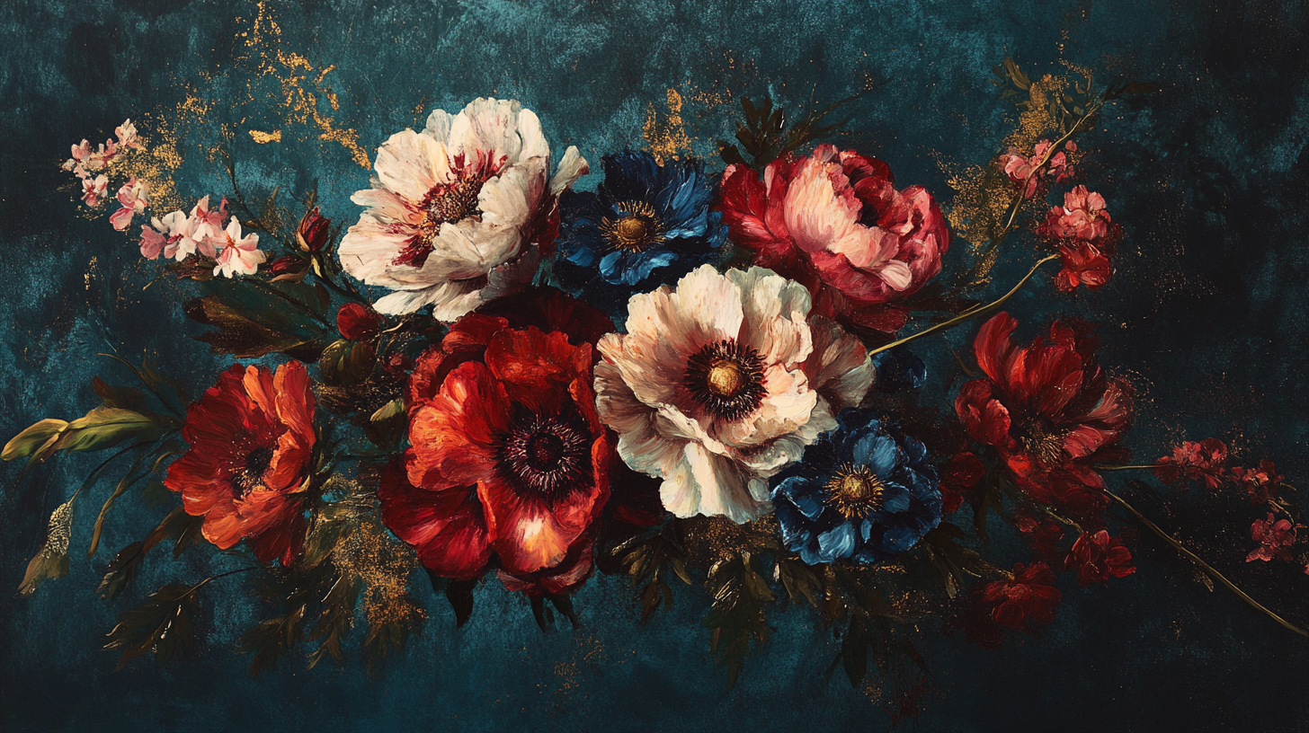 Opulente Blumen im niederländischen Stillleben-Stil in tiefem Rot und